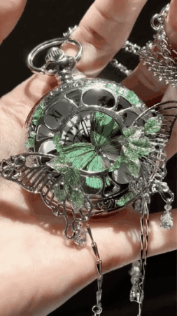 This butterfly pocket watch is crafted as a statement piece, blending timeless design with intricate gothic detail. Delicate butterfly motifs are carefully worked into the casing, creating a symbolic balance of beauty and mystery. Each curve and engraving is designed to add depth and character, giving the watch a distinctive, handcrafted appearance.